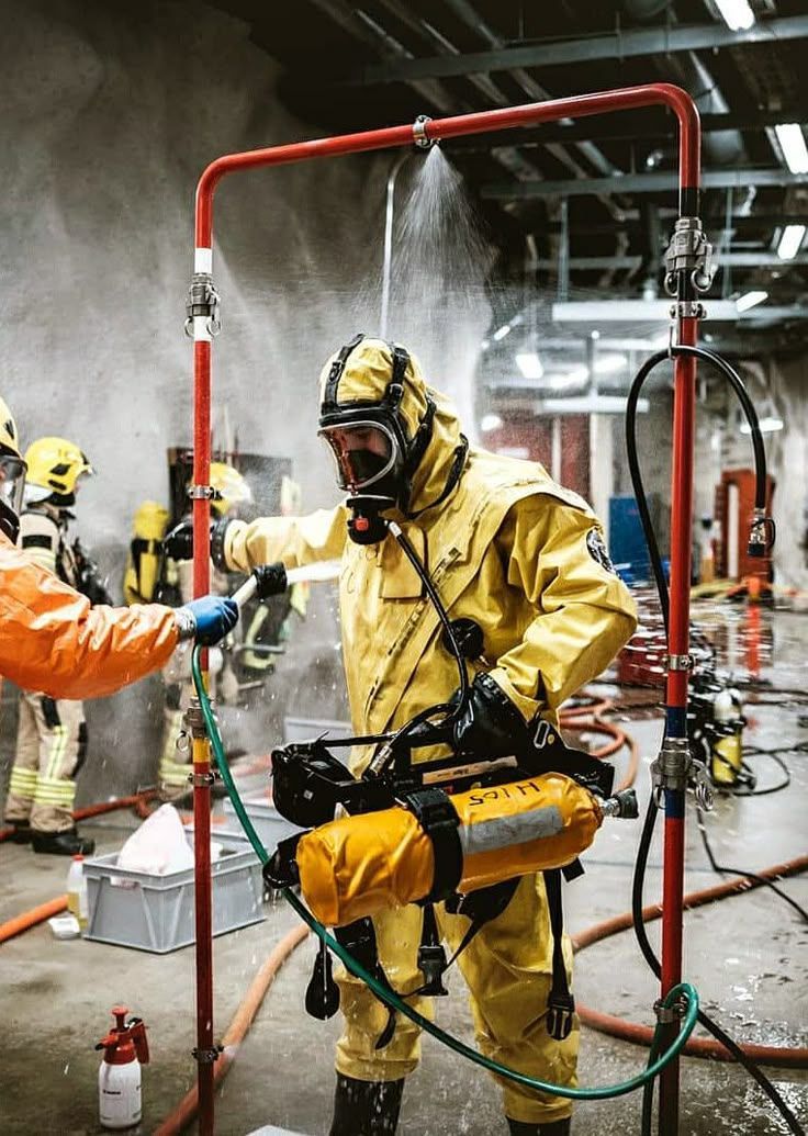 Uso de EPP: Los estudiantes practican con trajes encapsulados de entrenamiento y equipos de respiración autónoma